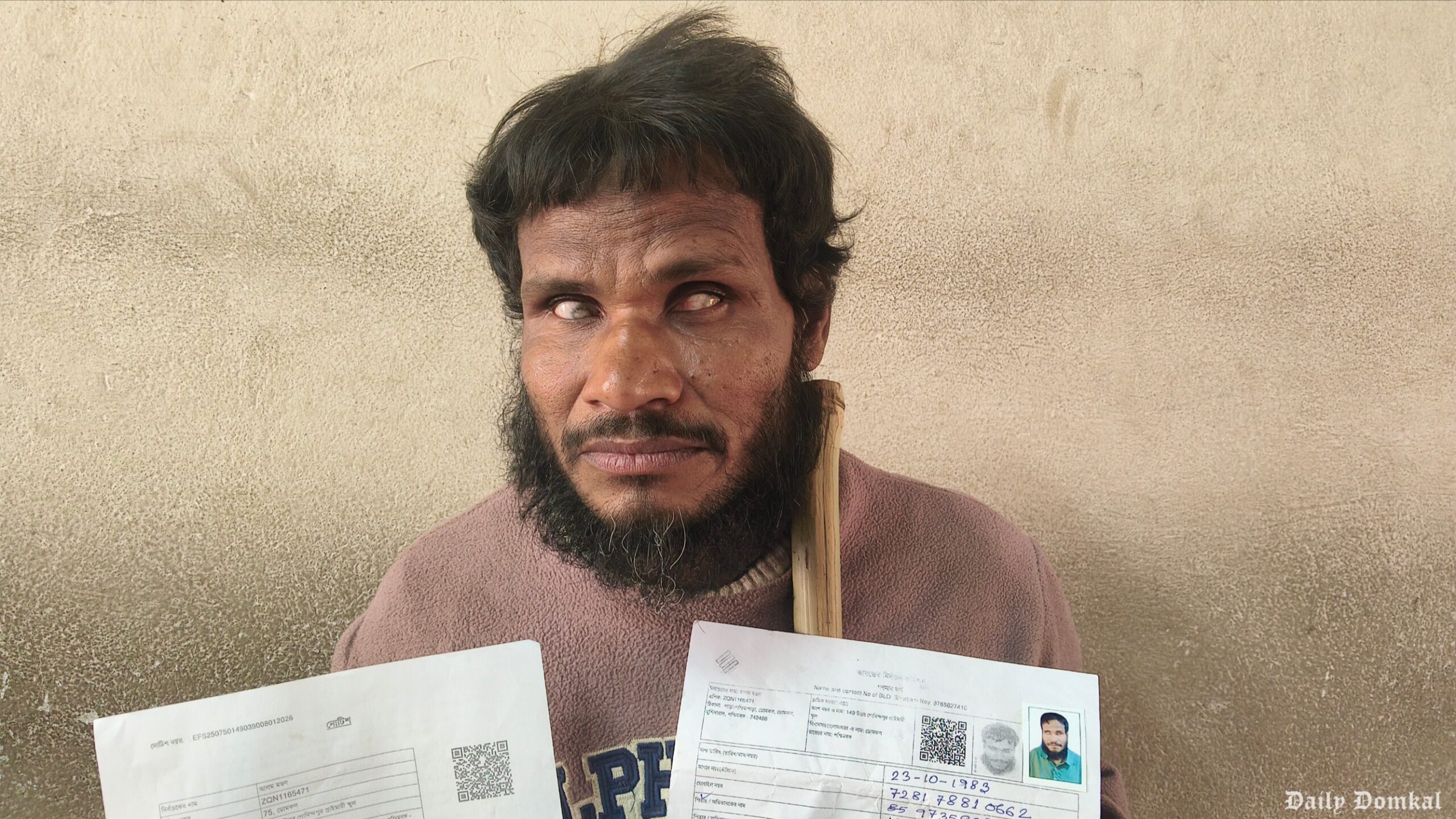 সুরাইয়া সুমি সরকার: নির্বাচন কমিশনের নিবিড় সংশোধনীর জাঁতাকলে মানুষের জীবন কীভাবে দুর্বিষহ হয়ে উঠতে পারে, তার এক মর্মান্তিক প্রতিচ্ছবি ফুটে উঠল মুর্শিদাবাদের ডোমকলে। যে চোখে কোনোদিন পৃথিবীর আলো পৌঁছায়নি, সেই জন্ম-অন্ধ চোখে এখন ঘুম কেড়ে নিয়েছে ‘এক টুকরো কাগজ’। ৪২ বছর বয়সী আলম মণ্ডল, যাঁর দিন কাটে দু’বেলা ভিক্ষা করে, আজ তাঁকে লড়াই করতে হচ্ছে নিজের অস্তিত্ব প্রমাণের জন্য। নির্বাচন কমিশনের বিশেষ নিবিড় সংশোধনী বা এসআইআর (SIR) প্রক্রিয়ার শুনানির নোটিশ হাতে নিয়ে এক অনিশ্চিত ভবিষ্যতের সামনে দাঁড়িয়ে দৃষ্টিহীন আলম মন্ডল। অনাথ দৃষ্টিহীন অসহায় ব্যক্তিকে নোটিশ ধরানোর ঘটনায় বিস্মিত ও ক্ষুব্ধ স্থানীয় বাসিন্দারা। তারা প্রশ্ন তুলছেন, “প্রশাসনের কি মানবিকতা বলে কিছু নেই?”