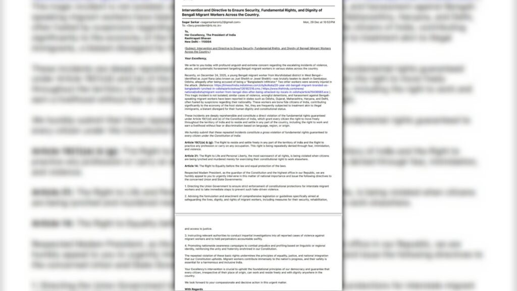 আবেদনে বলা হয়েছে, এই শ্রমিকরা ভারতের বৈধ নাগরিক এবং সংশ্লিষ্ট রাজ্যগুলির অর্থনীতিতে গুরুত্বপূর্ণ অবদান রাখছেন। তবুও শুধুমাত্র ভাষাগত পরিচয়ের কারণে তাঁদের ভিনদেশি সন্দেহে হেনস্থা করা হচ্ছে, যা মানবিক মর্যাদা ও সাংবিধানিক অধিকারের চরম লঙ্ঘন। রাষ্ট্রপতির দৃষ্টি আকর্ষণ করে আবেদনকারীরা সংবিধানের একাধিক অনুচ্ছেদের উল্লেখ করেছেন। তাঁদের মতে, — অনুচ্ছেদ ১৯(১)(ই) ও ১৯(১)(গ)— দেশের যে কোনও প্রান্তে বসবাস ও পেশা গ্রহণের অধিকার ভয়, হুমকি ও হিংসার মাধ্যমে কার্যত কেড়ে নেওয়া হচ্ছে। অনুচ্ছেদ ২১— জীবন ও ব্যক্তিস্বাধীনতার অধিকার গুরুতরভাবে লঙ্ঘিত হচ্ছে, যখন মানুষ শুধুমাত্র কাজের জন্য ভিনরাজ্যে যাওয়ায় প্রাণ হারাচ্ছেন। অনুচ্ছেদ ১৪— আইনের চোখে সমতার অধিকার ক্ষুণ্ণ হচ্ছে।