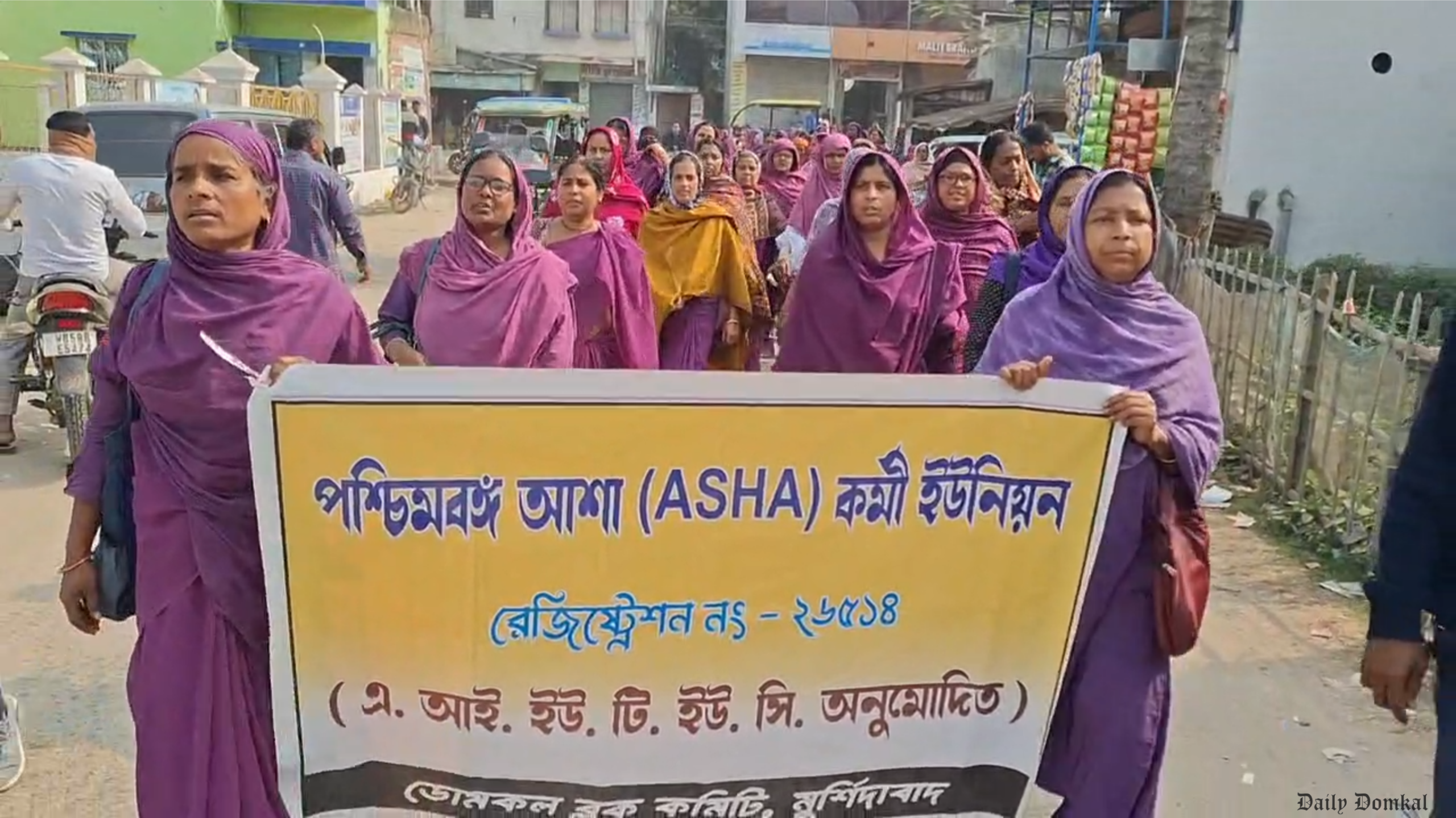 নিজস্ব সংবাদদাতা, ডোমকল: ন্যূনতম বেতন বৃদ্ধি, সরকারি স্বাস্থ্যকর্মীর স্বীকৃতি ও বকেয়া ভাতা পরিশোধসহ একাধিক দাবিতে আশাকর্মীদের স্বাস্থ্য ভবন অভিযান ঘিরে ধুন্ধুমার পরিস্থিতি তৈরি হয়। গত বুধবার (২১ জানুয়ারি) কলকাতায় স্বাস্থ্য ভবন অভিযানে যোগ দিতে যাওয়া আশাকর্মীদের আটকে দিতে রাজ্যের বিভিন্ন প্রান্তে পুলিশি বাধার ছবি সামনে আসে। অভিযোগ, বহু জায়গায় আশাকর্মীদের পুলিশি হেনস্থা ও শারীরিক নিগ্রহ করা হয়। এই ঘটনার প্রতিবাদে শনিবার রাস্তায় নামলেন আশাকর্মীরা। এদিন পশ্চিমবঙ্গ আশা কর্মী ইউনিয়নের ডোমকল শাখার সদস্যরা প্রতিবাদ মিছিল করেন। ডোমকল হাসপাতাল চত্বর থেকে শুরু হয়ে বিডিও মোড় হয়ে এসডিও অফিস চত্বরে গিয়ে শেষ হয় আশাকর্মীদের মিছিল। মিছিল চলাকালীন রাজ্য সরকারের বিরুদ্ধে স্লোগানে মুখরিত হয়ে ওঠে ডোমকলের রাজপথ। মিছিল শেষে আশাকর্মীরা ন্যূনতম মাসিক সম্মানিক বৃদ্ধি, বীমা সুরক্ষা-সহ তাঁদের দীর্ঘদিনের দাবি দ্রুত পূরণের আহ্বান জানান। দাবি মানা না হলে আগামী দিনেও আরও বৃহত্তর আন্দোলনের হুঁশিয়ারি দেন তাঁরা। আন্দোলনকারীদের স্পষ্ট বক্তব্য, দাবি আদায় না হওয়া পর্যন্ত এই কর্মবিরতি ও আন্দোলন থেকে তাঁরা এক চুলও সরবেন না।