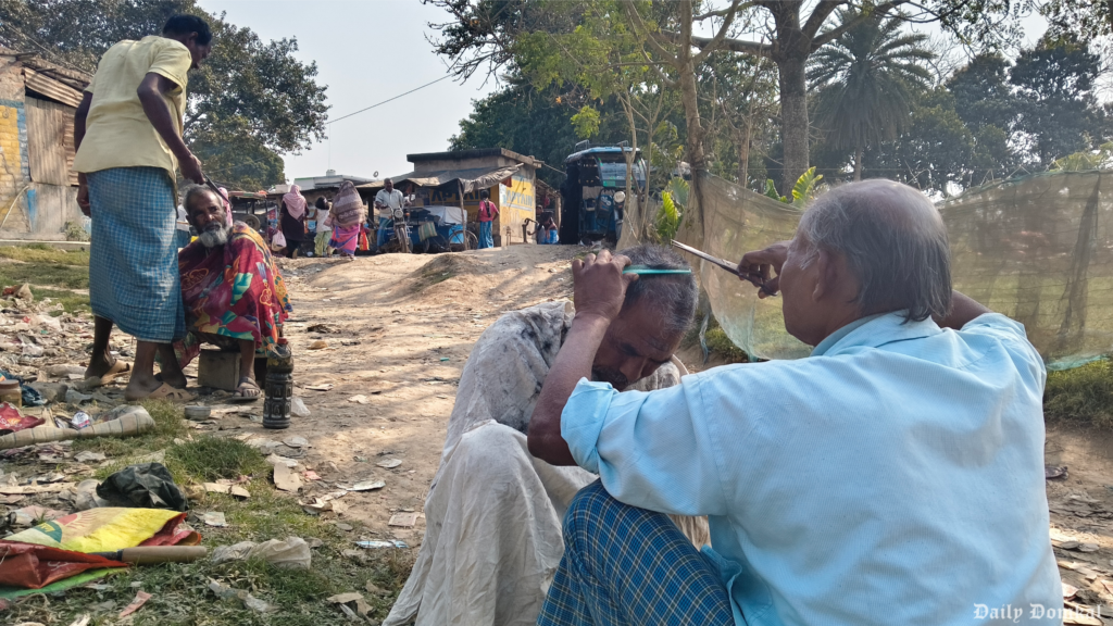 (ইসলামপুরে কাঠের পিঁড়িতে বসেই চলছে চুল-দাড়ি কাটা। || Image: Daily Domkal)